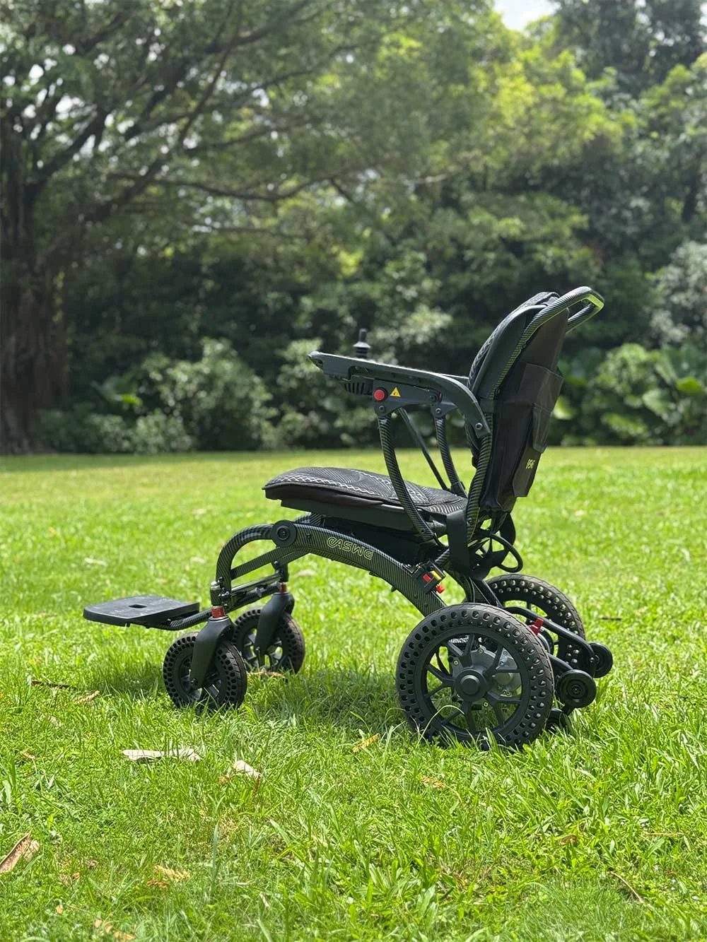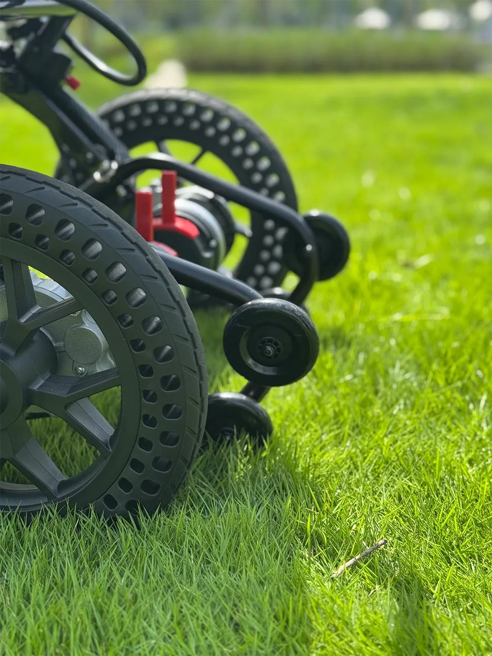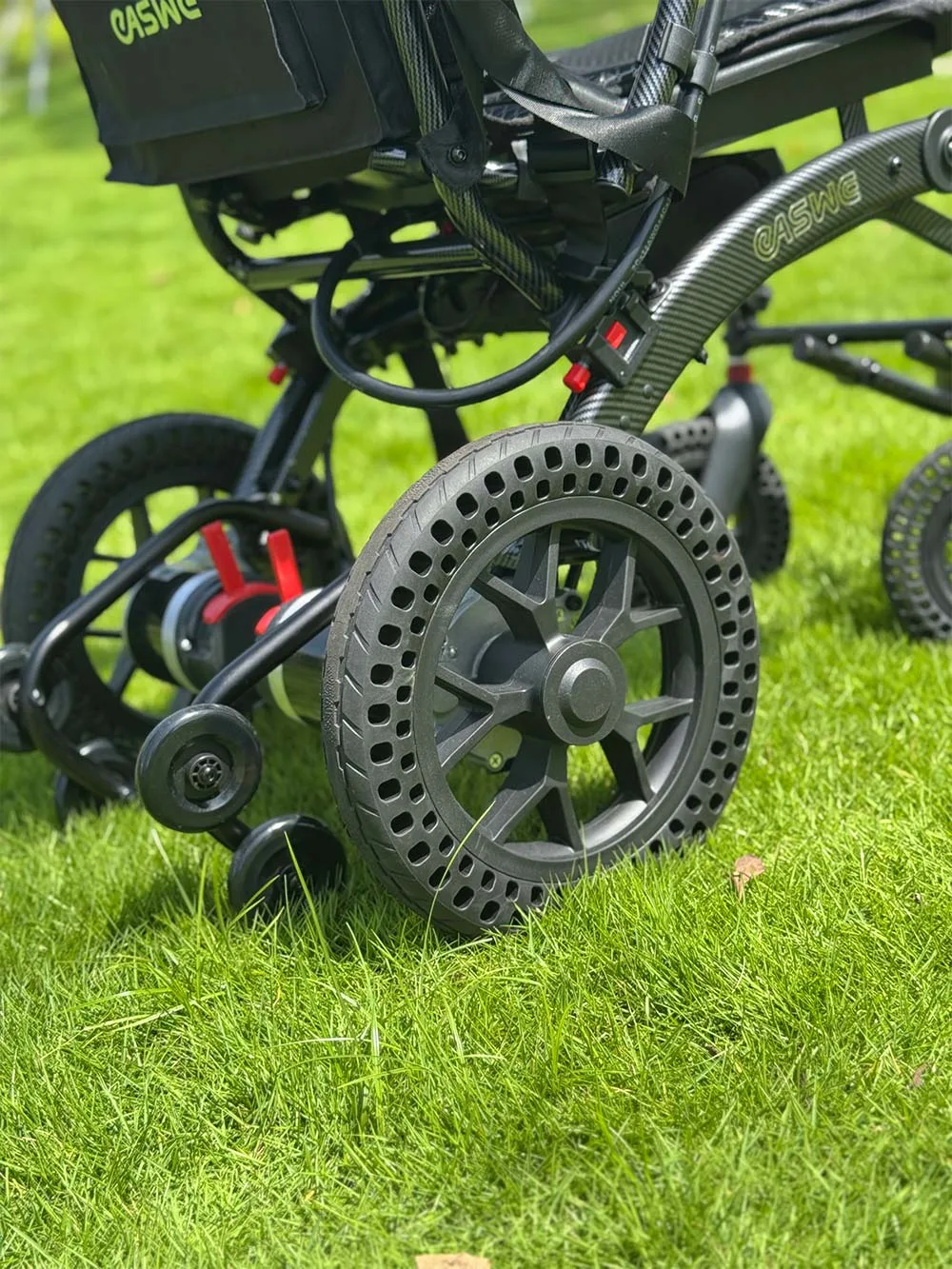 Nuestras sillas de ruedas eléctricas tienen neumáticos de panal en las ruedas delanteras y traseras, lo que las hace adecuadas tanto para uso interior como exterior.